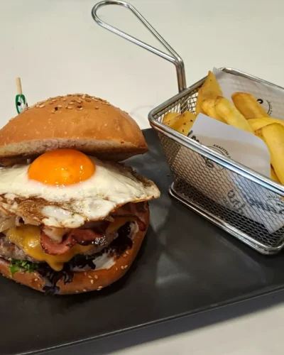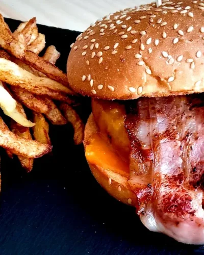 TRADICIONAL Carne de vaca, 150gr. con queso, bacón y patatas…