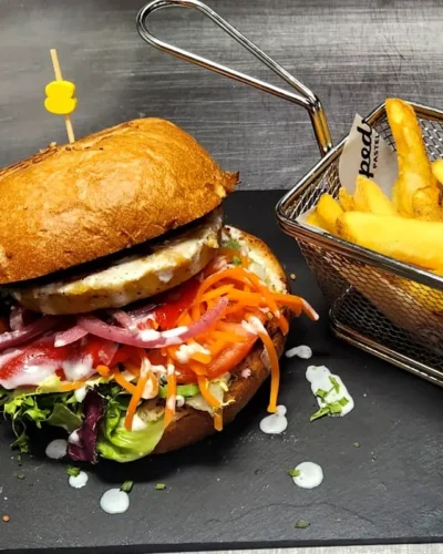 VEGETARIANA Hamburguesa vegetal, crema de espinacas, mezclum, tomate, zanahoria rallada,…