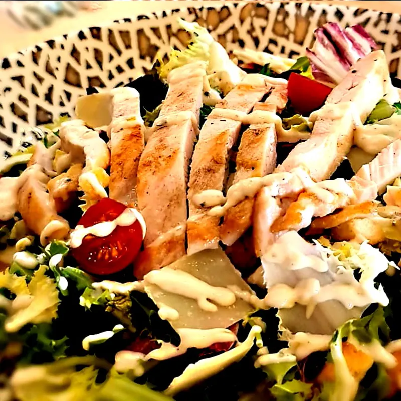 Pollo a la plancha, salsa césar, mezclum, tomate cherry, picatostes, sabor a ajo, queso grana padano