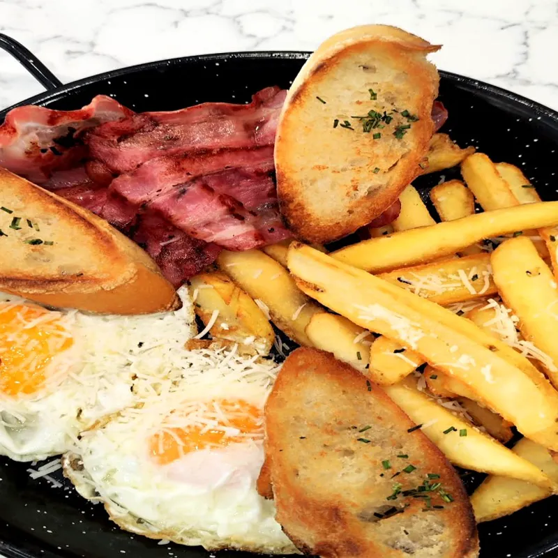 Fritos con bacón, queso rallado y patatas