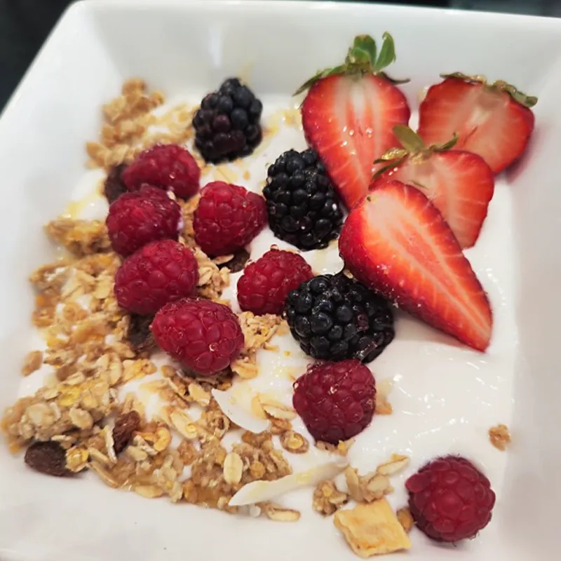 Yogurt griego, muesli de frutas confitadas y frutos rojos